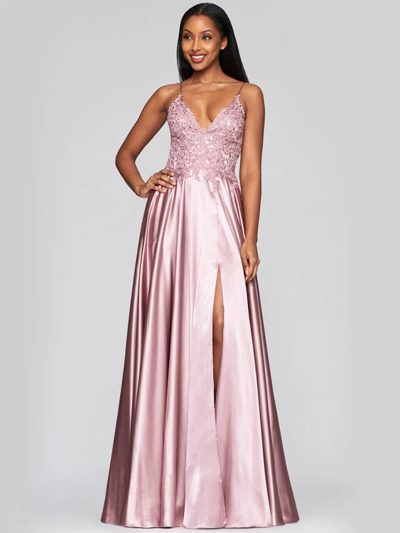 Exude elegance as you dance the night away in this prom dress. The charmeuse dress offers a v-neck with thin straps, gorgeous intricate applique bodice, and flowing A-line skirt. This dress is finished with a lace up back.