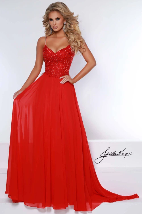 Feel like royalty in this beautiful evening dress. The sleeveless dress has a V-neckline, beaded lace bodice, and mid-open back. A chiffon A-line skirt completes this dress.