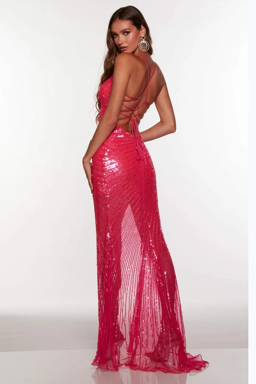 This gown makes a lasting impression with a v-neckline and spaghetti straps. The sequin beaded dress appears to have a ruched like gathering as the stripe seems to burst out from the side. The open back and side slit is just as eye catching.
