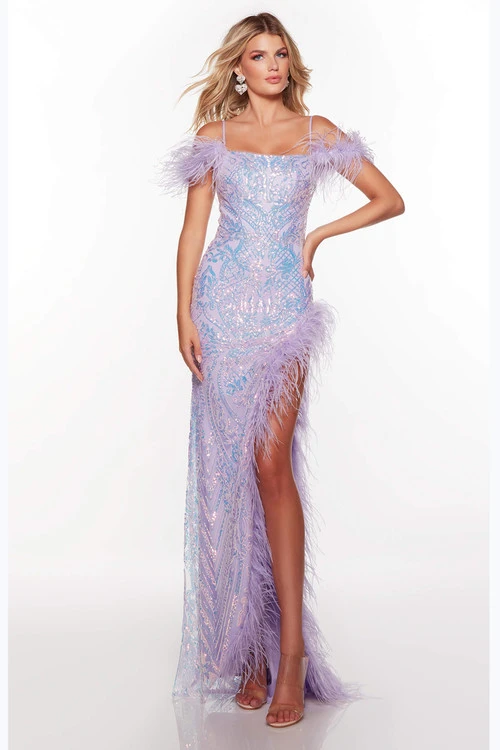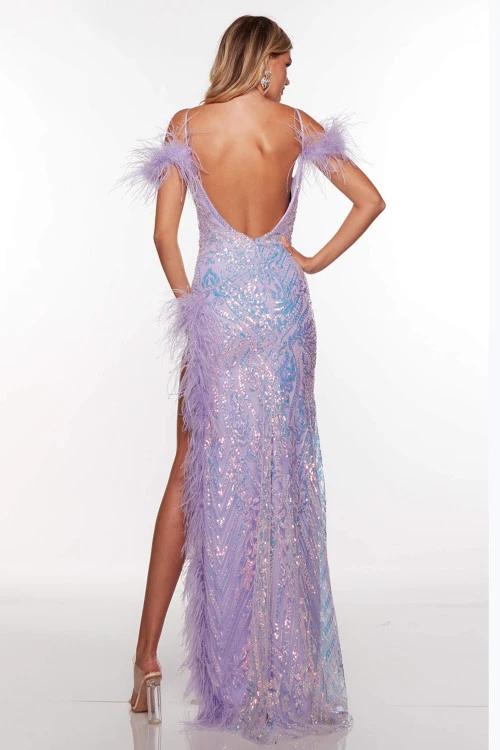Be remembered as the best dressed prom night in this gorgeous sequin beaded formal gown. The cold shoulder neckline has feathered accent on the sleeves and lining the high slit. The open back is a fantastic addition to this show stopper.