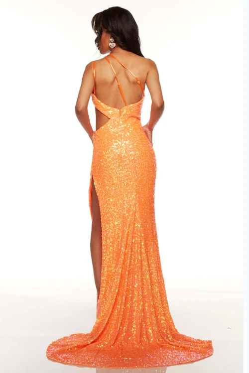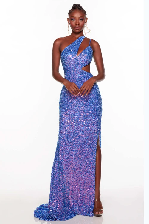 Be bold and daring prom night in this attention grabbing formal dress. Made with an one shoulder neckline that has intricate cut-outs and three spaghetti straps in the back. The low slit on the side and sweeping train are great additions to this stunning gown.