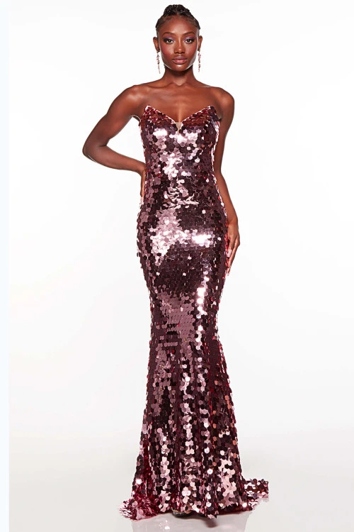 Dance like no one is watching in this stunning strapless formal dress. The form fitted gown is beaded with paillette sequins and a lace-up back. The sweeping train makes a statement on the dance floor.