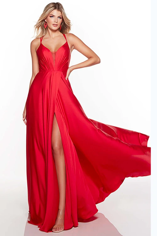 Show your front cover ready in this chic formal gown. Made with a pleaded bust and plunging v-neckline that is eye-catching. The double straps leads to an criss-cross open back. The satin chiffon skirt is a full A-line with a high slit on the side.