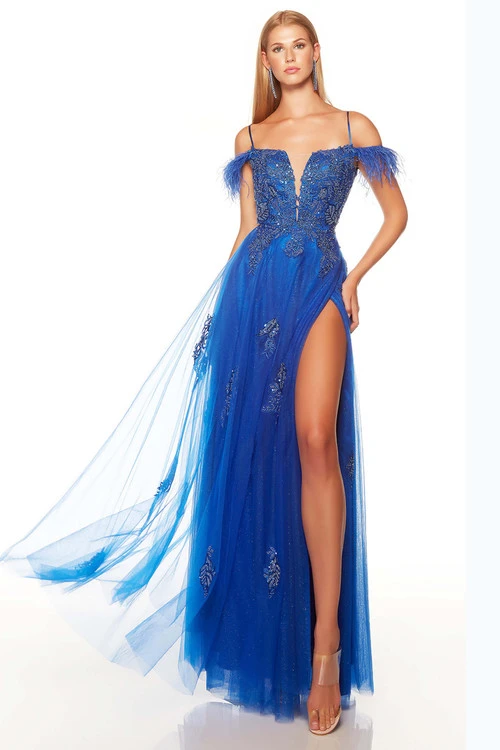 Take your date’s breath away when you show up to prom in this cold shoulder formal gown with feather accent off the sleeve. The back of the gown has a lace up that leads to an cut-out open back. The gown has beaded applique scattered throughout the dress.