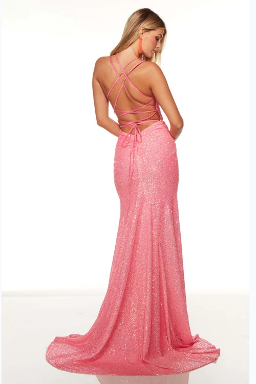 Charm your date in this magnificent v-neckline formal gown that is ruched to the side. The form fitted dress accentuates your curves as the strappy open back grabs attention. The sweeping train and high slit are conversation pieces.