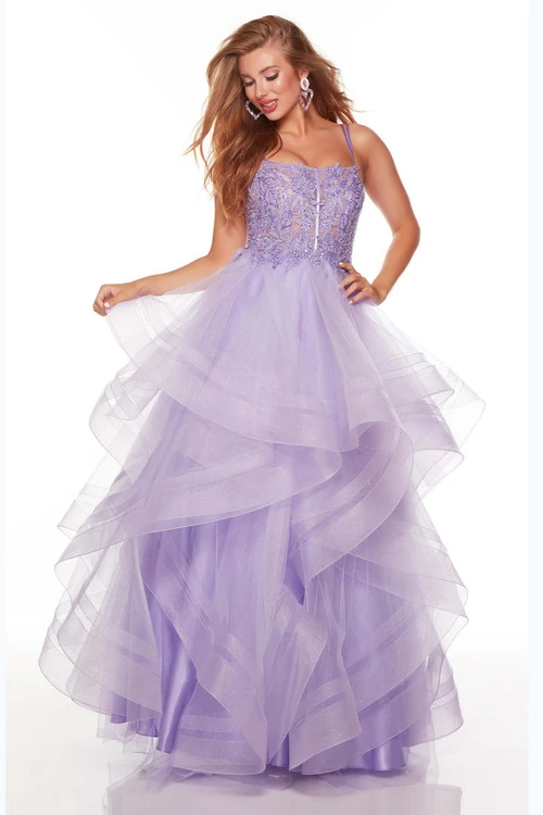 Break hearts in this square neckline ball gown. The top bodice has floral lace appliques on a sheer corset with lace up back. The tulle skirt has layers and layers of ruffles for a full A-line look.