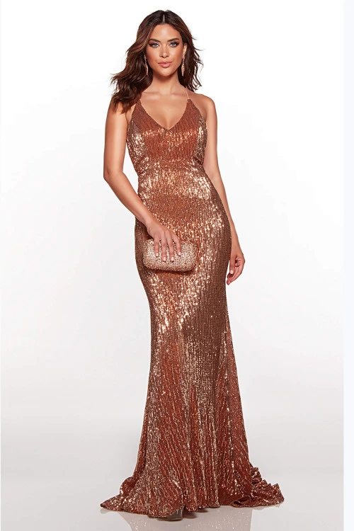 Now is the time to stand out above the crowd in this eye-catching sequin formal gown. Made with a v-neckline and an intricate open back. The sheath bodice leads to a long sweeping train.