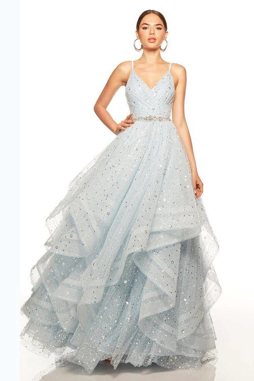 Be the belle of the ball in this ruffled layers ball gown. The v-neckline dress has a pleaded bust with a rhinestone beaded belt-like accent at the natural waist. The sequin tulle skirt with full for a captivating look.