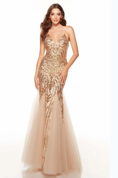 Take over prom night in this intricate beaded formal gown. The v-neckline dress is overshadow by the criss cross spaghetti straps and lace-up back for the perfect fit. Your curves will be accentuated as the gown leads to a layer of tulle on the skirt.