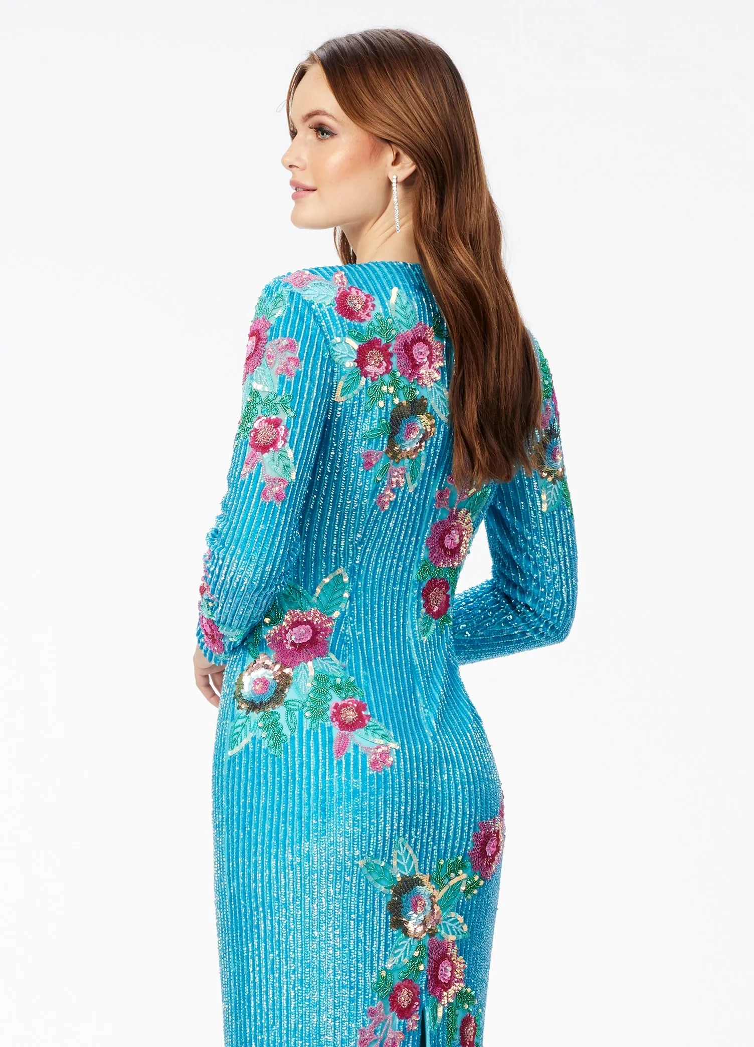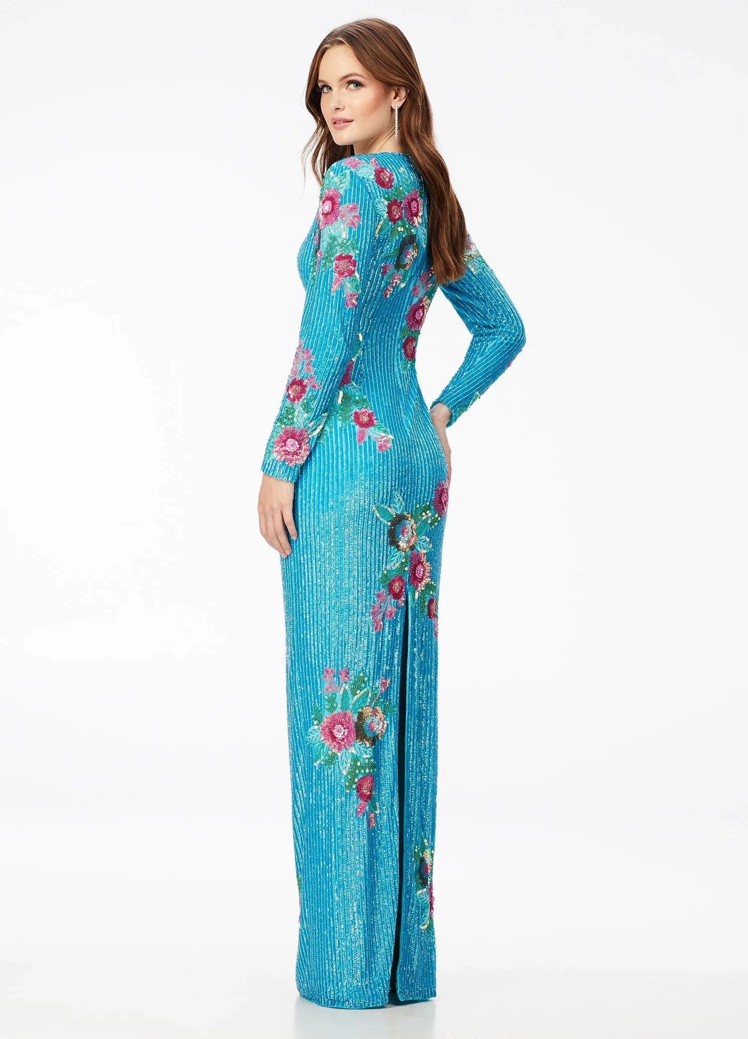 Ashley Lauren – Fully Beaded Long Sleeve Gown With Floral Details | Runway Fashion Haus