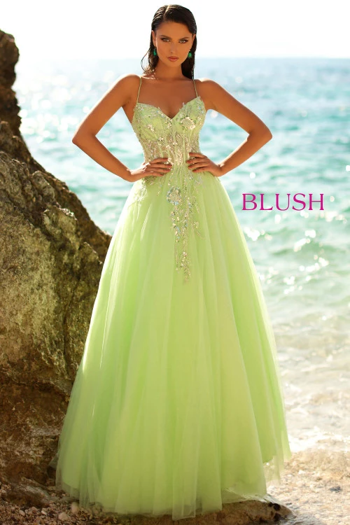 Create lasting memories in this stunning prom dress. The sleeveless dress offers a sweetheart neckline with thin spaghetti straps, fitted sheer bodice adorned with floral detail, and exposed boning. Completing this dress is a full ball gown skirt. The open back with lace up straps ensures you will leave lasting impression at your dance.