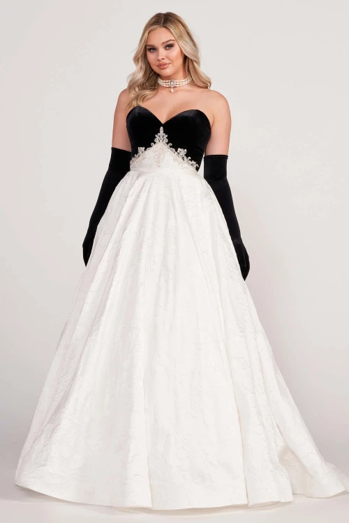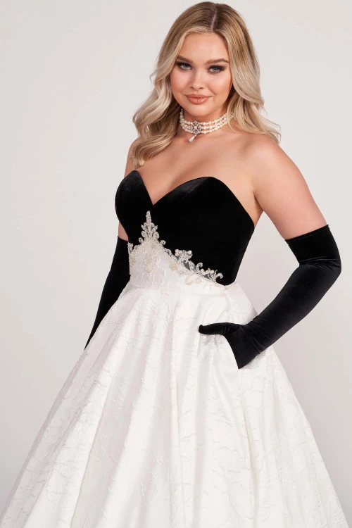 Look like a royalty at your senior prom in this elegant prom dress. Featuring a sweetheart neckline, black velvet bodice, delicate beaded accent at the waist, and a jacquard ball gown skirt with pockets. This dress comes with matching gloves and a necklace.