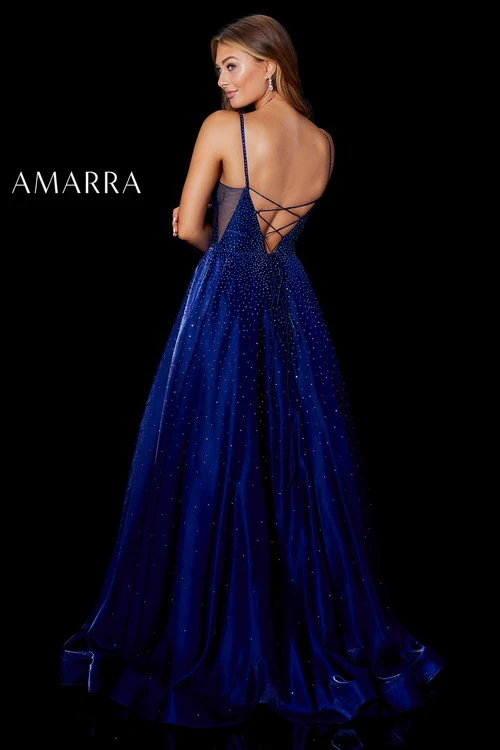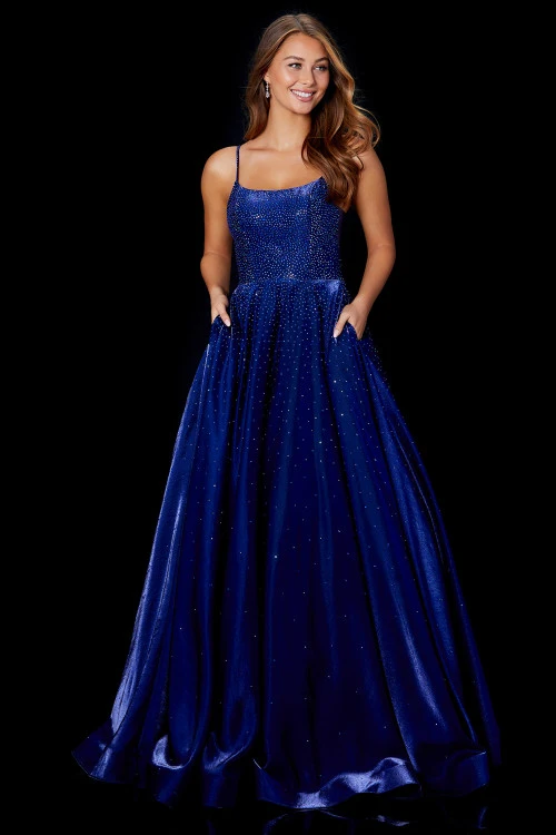Make a memorable entrance in this stunning prom dress. The navy satin dress has a scoop neckline with spaghetti straps, fitted bodice adorned with stones, and ball gown skirt with pockets. The open back will make heads turn as you enter to the room.