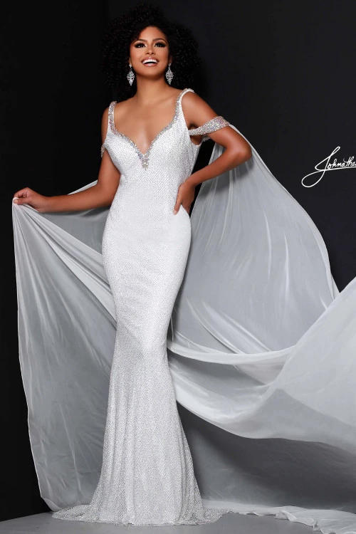 Make a dramatic entrance in this runway worthy pageant dress. The crystal mesh dress features a V-neckline with beaded trim, fitted bodice, and beaded off the shoulder straps. A floor length skirt with over the top chiffon cape completes this dress. The cutout back finishes this dress.