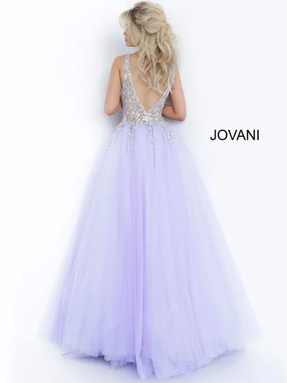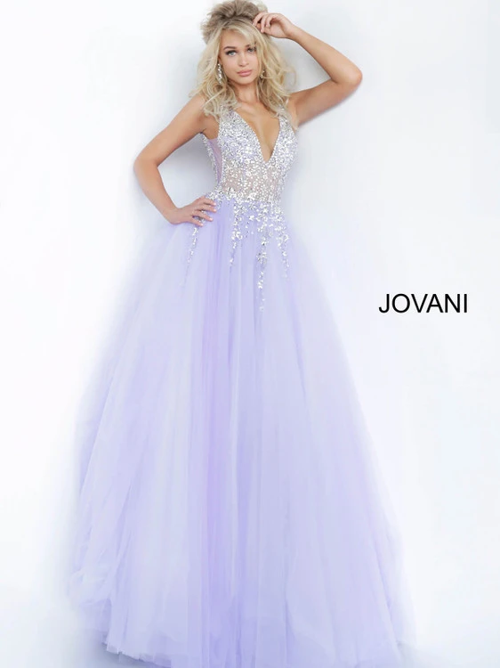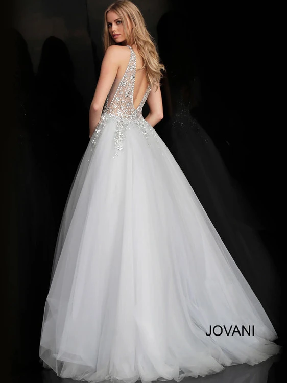 Live your prom fairy-tale by wearing this breathtaking ball gown sure to pop out from the crowd. The illusion bodice embellished with opulent crystal details, showcases a v-plunging design, both front and back as well as open sides for a sizzling touch. A voluminous skirt made out of yards and yards of romantic tulle fabric, has matching ornaments that trail down the waist and the regal sweep train.