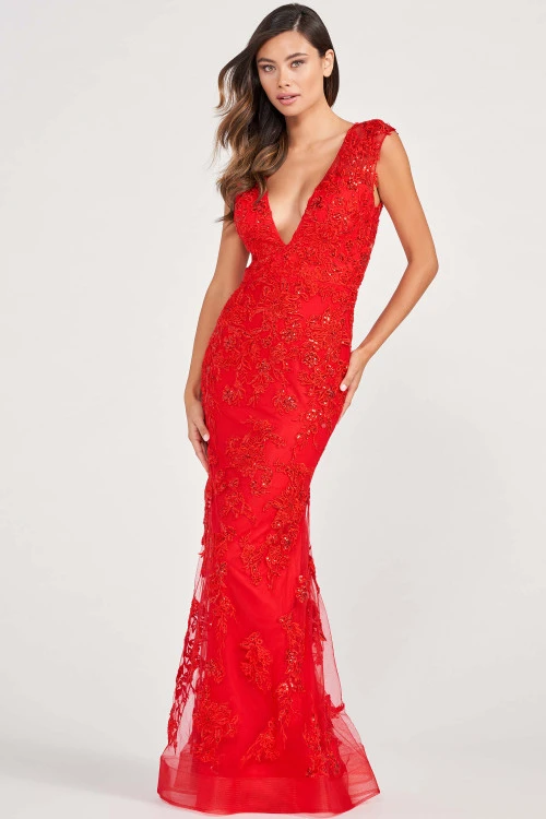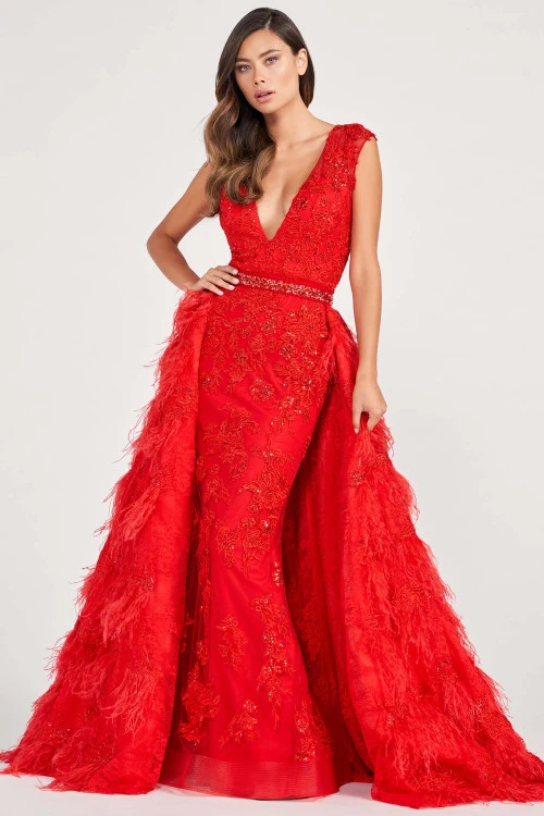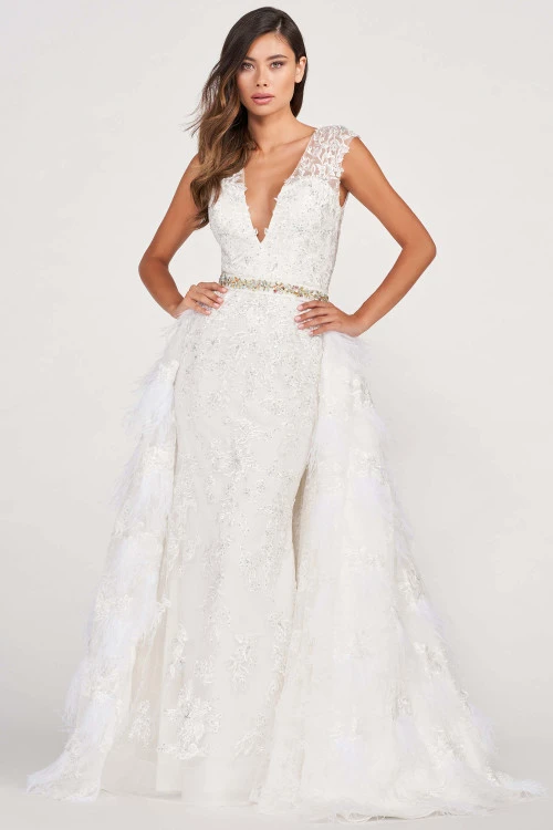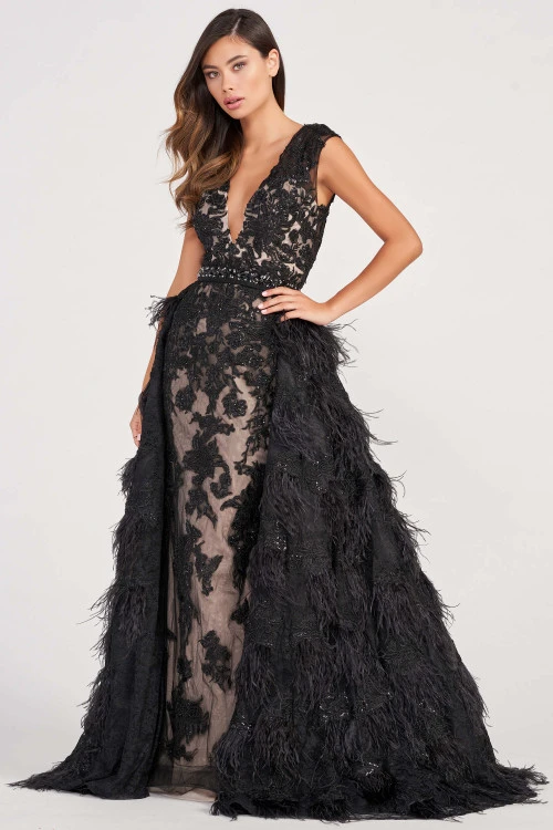 Make a lasting impression in this fashion forward luxe dress. The dress’s tulle is embroidered with lace concentrated at the waist to minimize your waistline. A voluminous feather overskirt adds drama and makes this dress a two-in-one look.