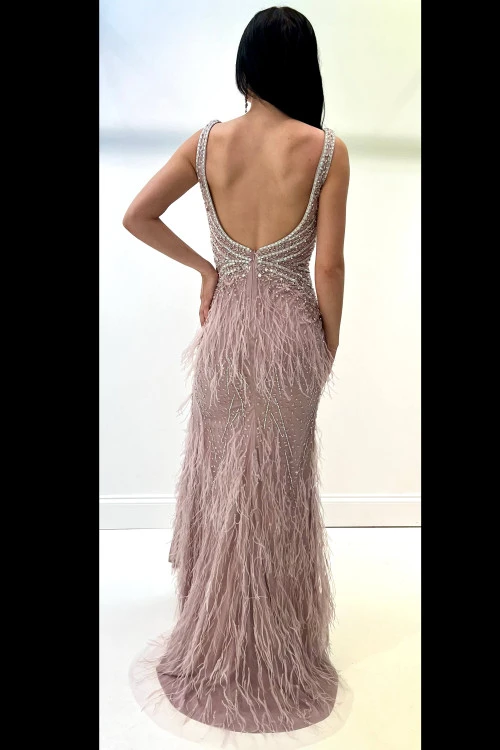 Have the time of your life in this unique beaded evening gown. This gown has a plunging V-neckline and sheath bodice. The feathered skirt and as eye-catching as the scooped open back.