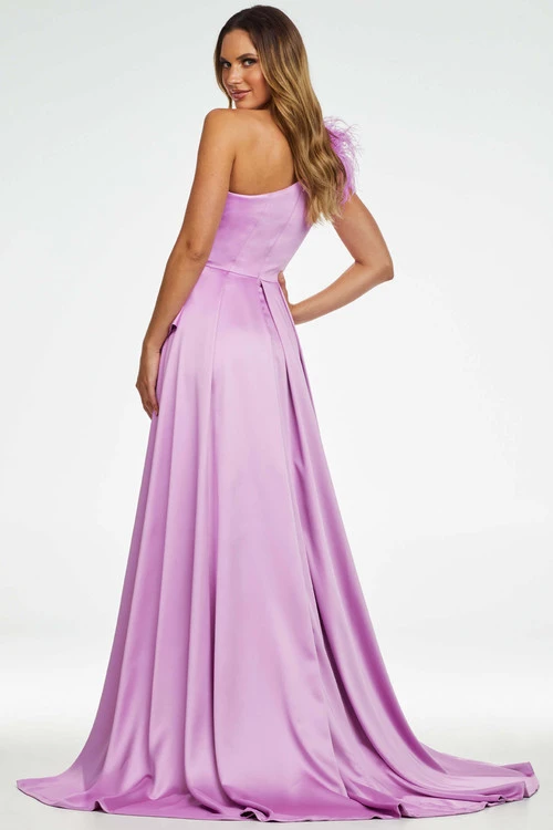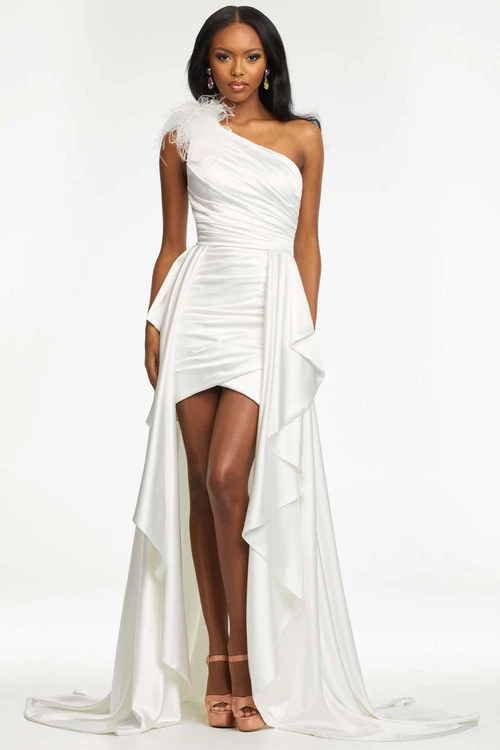 Look sassy and ravishing in this satin prom dress with a hi-low appearance to let you show off your legs gracefully. A softly ruched mini dress flaunts a fitted shape, a nipped natural waist, a slanted neckline and an exotic feathered-touch on top of the single shoulder. A beautifully attached A-line overskirt, drapes on the sides and extends into a glamorous sweep train. Enclosed back with zipper closure.