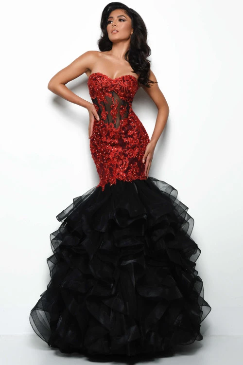 Make a jaw dropping entrance in this stunning prom dress. Featuring a sweetheart neckline, fitted sheer corset bodice adorned with delicate lace appliques, and expose boning. A mermaid skirt with ruffles completes this dress.