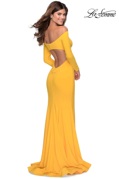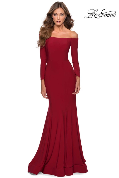 Be the one to remember in this chic long dress. The jersey dress has an off the shoulder neckline with long sleeves, fitted bodice, and floor length skirt with a sweep train. This dress is finished with a cutout open back.
