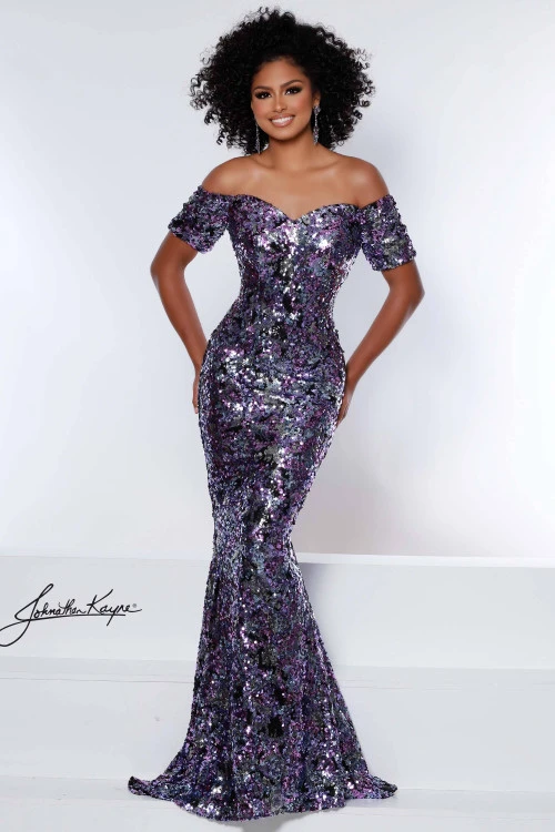 Get ready to shine in this fabulous evening dress. The stretch sequin dress offers a sweetheart neckline, fitted bodice, and off the shoulder sleeves. A floor length skirt with a horsehair hem and sweep train completes this dress.