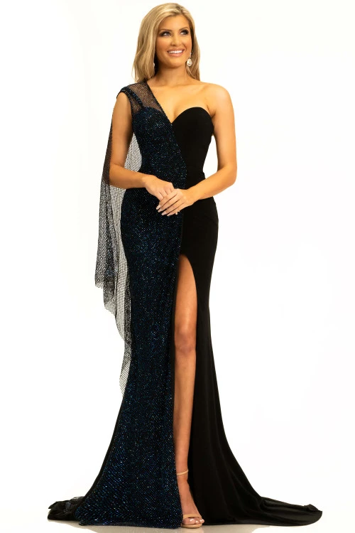 Sophistication is key for your senior pageant when slipping on this elegant gown. The matte jersey dress with stretch lining offers a sweetheart neckline, fitted bodice, and floor length skirt with a side slit. This dress has one shoulder strap with a sheer crystal mesh cape that flows over the shoulder and down the back of the dress.