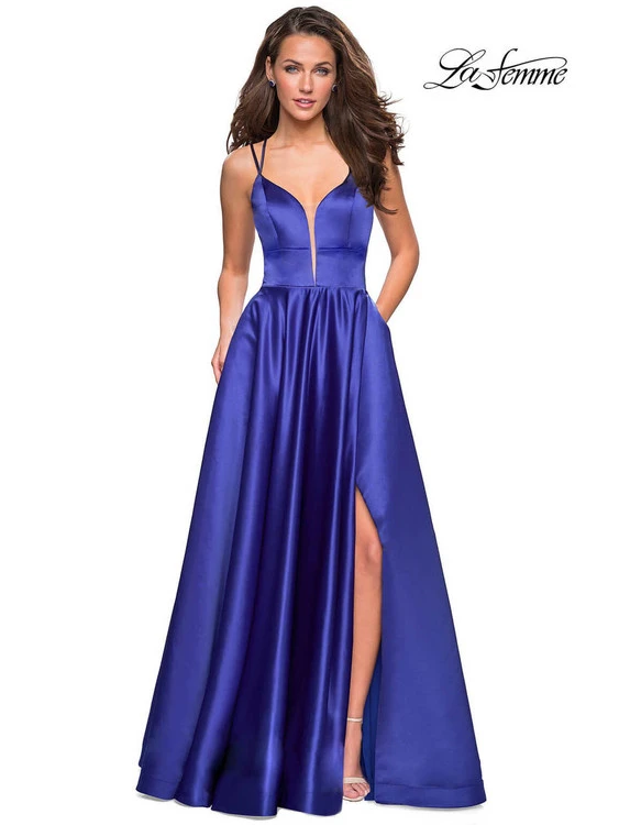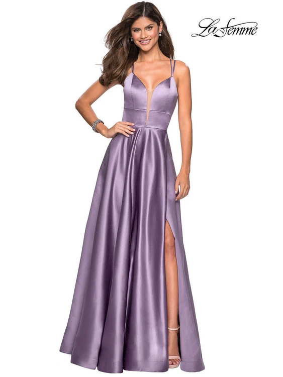 Be the best dress at your next formal event in La Femme Prom Dress 26994. Made with a plunging v-neckline and a sexy strappy open back that looks lovely on the dance floor. The A-line satin skirt show off your tone legs with from the high slit on the side.