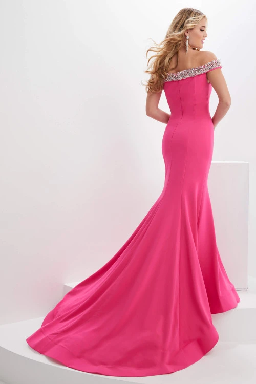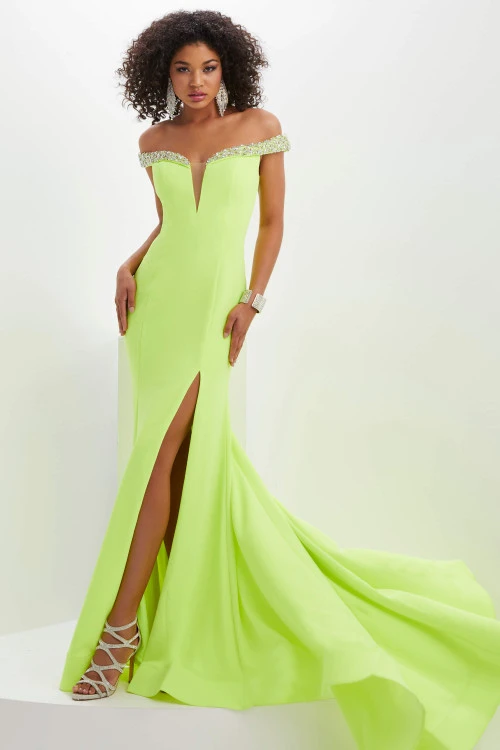 Take on the world in this boss chick off the shoulder neckline formal dress and plunging neckline. The form fitted bodice looks amazing as it hugs your curves and flows down to a long sweeping train. Pair your favorite nude heels to reveal your tone legs.