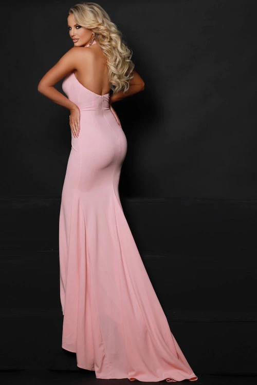 Set the trend at your next prom event in this tuxedo-inspired dress that features a lapelled halter top empowered with a sexy V-plunging neckline. The slim bodice has covered buttons on the sides and a skirt that flares into a soft mermaid design. The entire silhouette is made of stretch crepe that adds beauty to your body assets. A skin-revealing, scoop back has a centered zipper closure and a sweep train stunner.
