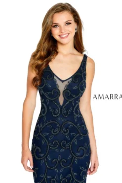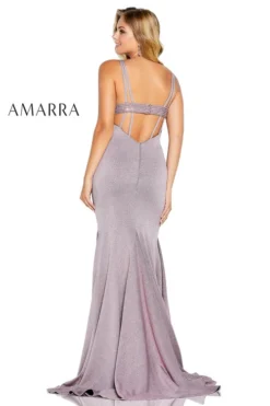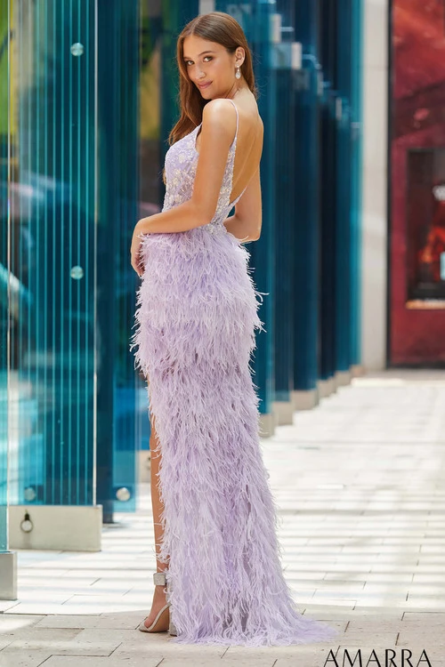 Have a major fashion moment at your prom and rock this Amarra prom dress. The lilac dress offers a deep V-neckline, gorgeous beaded bodice, and feathered floor length skirt with a side slit. This dress is finished with a v-back.