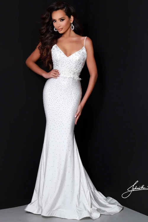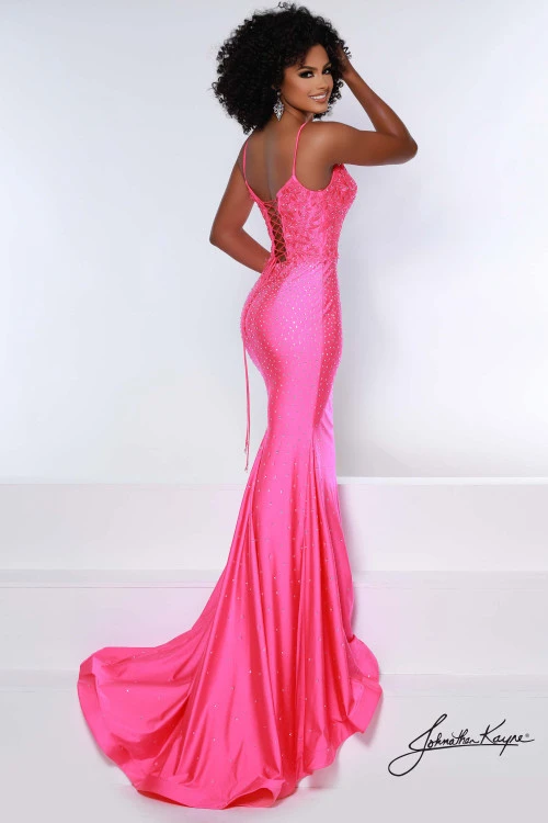 All eyes will be on you at your senior prom in this one of a kind dress. The sleeveless dress offers a V-neckline with spaghetti straps, gorgeous lace bodice, and corset lace up back. Completing this dress is a mermaid skirt with horsehair hem.